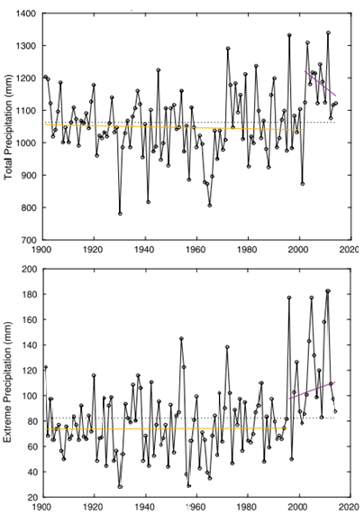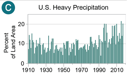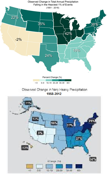 And Huang et al (2017) produce time series showing how total precipitation and extreme precipitation in the Northeast US have both increased since about 1960 (Figure 5):