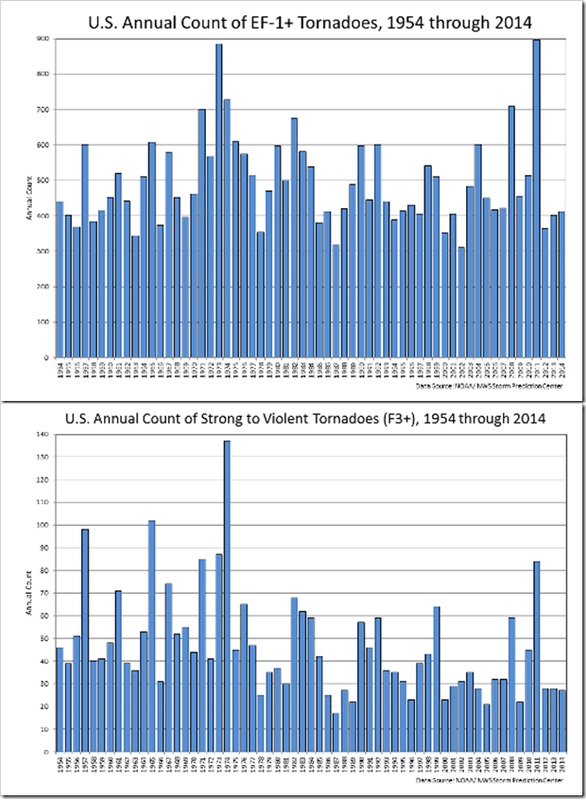 Some storm types such as … tornadoes … are also exhibiting changes that have been linked to climate change. Once more the Assessment presents no supporting data, but NOAA’s tornado counts (Figure 15) speak for themselves: