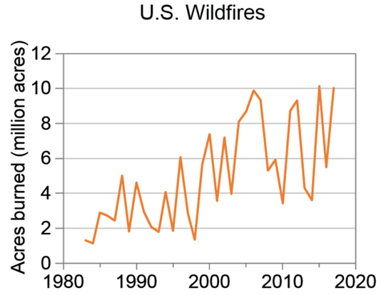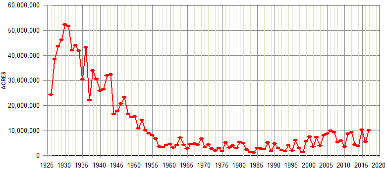 Figure 10: Acres burned by US wildfires. Figure 9 data carried back to 1926