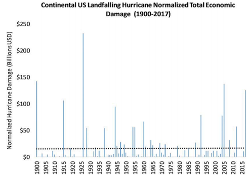 And according to Klotzbach et al (2018) there has been little to no increase in normalized hurricane damages in the US since 1900 (Figure 13):