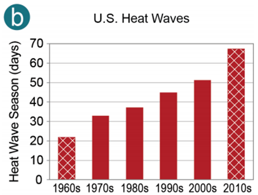 One of the problems with heat waves is defining them (droughts and floods have the same problem). How hot does it have to get, and for how long, before a warm spell becomes a heat wave? The Assessment does not tell us. All it presents in the way of evidence for an increase in heat waves in the introductory report sections, including the 186-page “Report-in-Brief”, is this graphic (Figure 6), which shows the “heat wave season” increasing since the 1960s but not how many heat waves there were. Once again the data source is not specified, nor is the meaning of the cross-hatching: