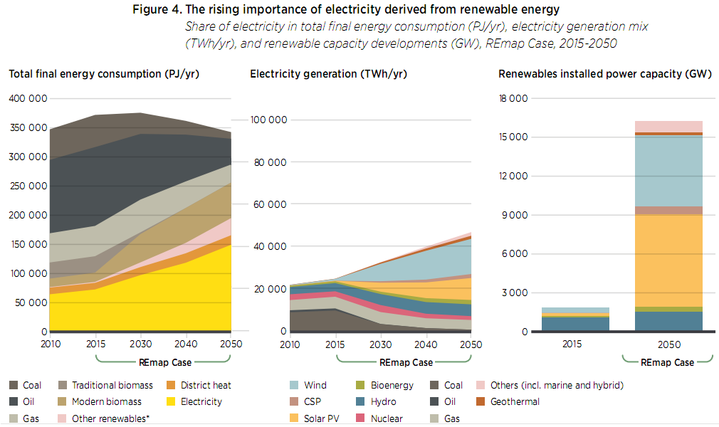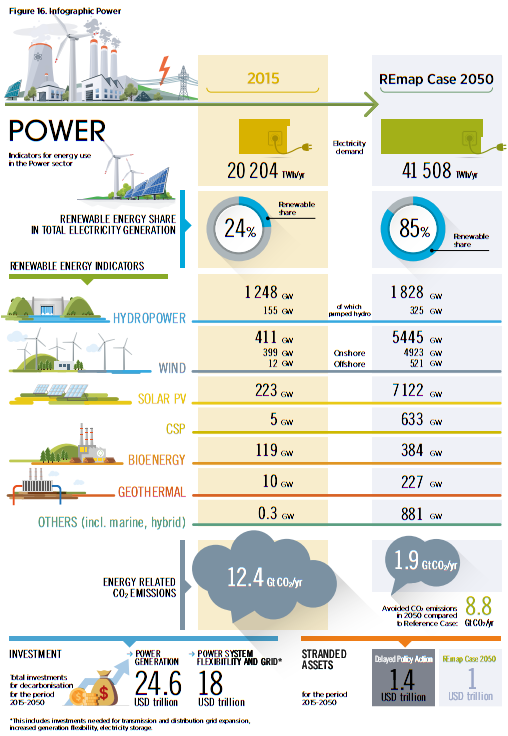 The REmap scenario envisions a doubling of electricity generation, achieved mostly by a massive expansion of wind and solar, coupled with a reduction in fossil fuel generation (Figure 3) …..