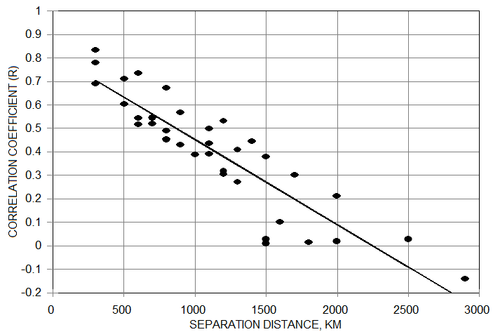 Figure 2 shows a number of cases where wind capacity factors are closely correlated between countries, such as between Germany and Denmark, and others where they are not, such as between Sweden and Spain. Such results would, however, be expected given that Germany and Denmark are next to each other while Sweden is a long way from Spain. I confirmed a correlation-distance relationship for the 2013 data in a graph posted in a comment on “wind blowing nowhere” and got the response shown in Figure 3. It shows the correlation coefficient (R) going asymptotic to zero (i.e. no correlation) at a separation distance of somewhere around 4,000 km: