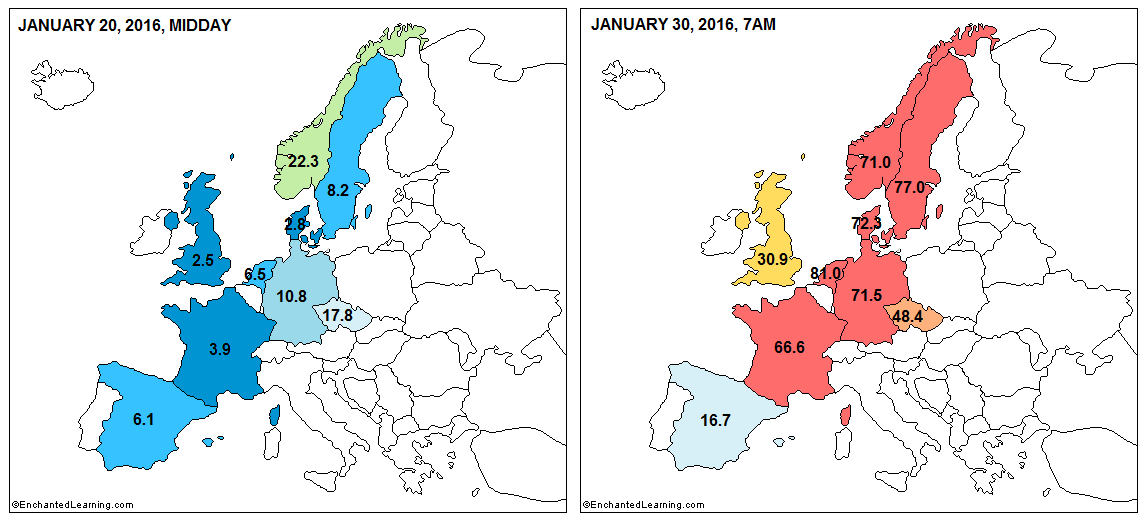 Figure 5 plots wind capacity factors for the two hourly periods in January 2016 where wind deficits and surpluses were largest, as discussed in the next section. The January 20 plot shows capacity factors below or well below average over all of Western Europe, further confirming that when the wind isn’t blowing somewhere it isn’t necessarily blowing somewhere else. The January 30 plot shows capacity factors above or well above average except in Spain, suggesting that when the wind is blowing hard somewhere it will probably be blowing hard in most other places too.
