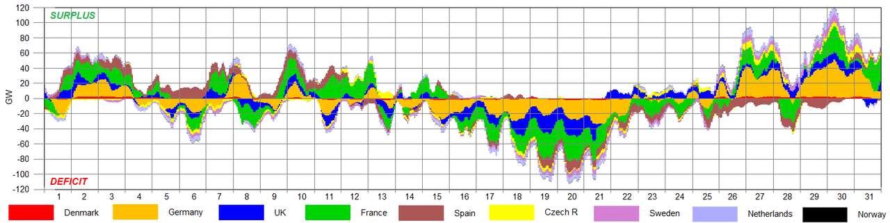 The results for January 2016 segregated by country are summarized graphically in Figure 6. There are occasions where the wind surpluses and deficits balance out (area above the zero line = area below) but for most of the time the plot is in surplus or in deficit. Summing the data for all nine countries shows the largest surplus (115.7 GW) occurring at 7 am on January 30 and the largest deficit (112.3 GW) at midday on January 20: