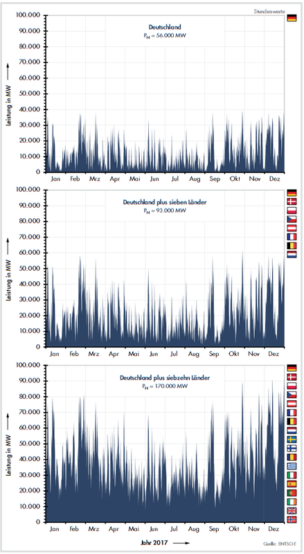 In the years from 2015 to 2017, the total time series of the total wind power production of the European countries under consideration show average lows of the available capacity between 6,000 and 8,000 MW. Despite the fact that wind turbine locations are distributed throughout Europe, this corresponds mathematically (without grid losses) to only 4 to 5 % of the total installed nominal capacity of all wind turbines of around 170,000 MW in the 18 countries. For the transport and distribution of electrical energy from generation to the consumer, grid losses of almost 7 % within one country alone must also be taken into account. This means that the already manageable mutual compensation possibilities between very far-flung European countries will be further reduced.”